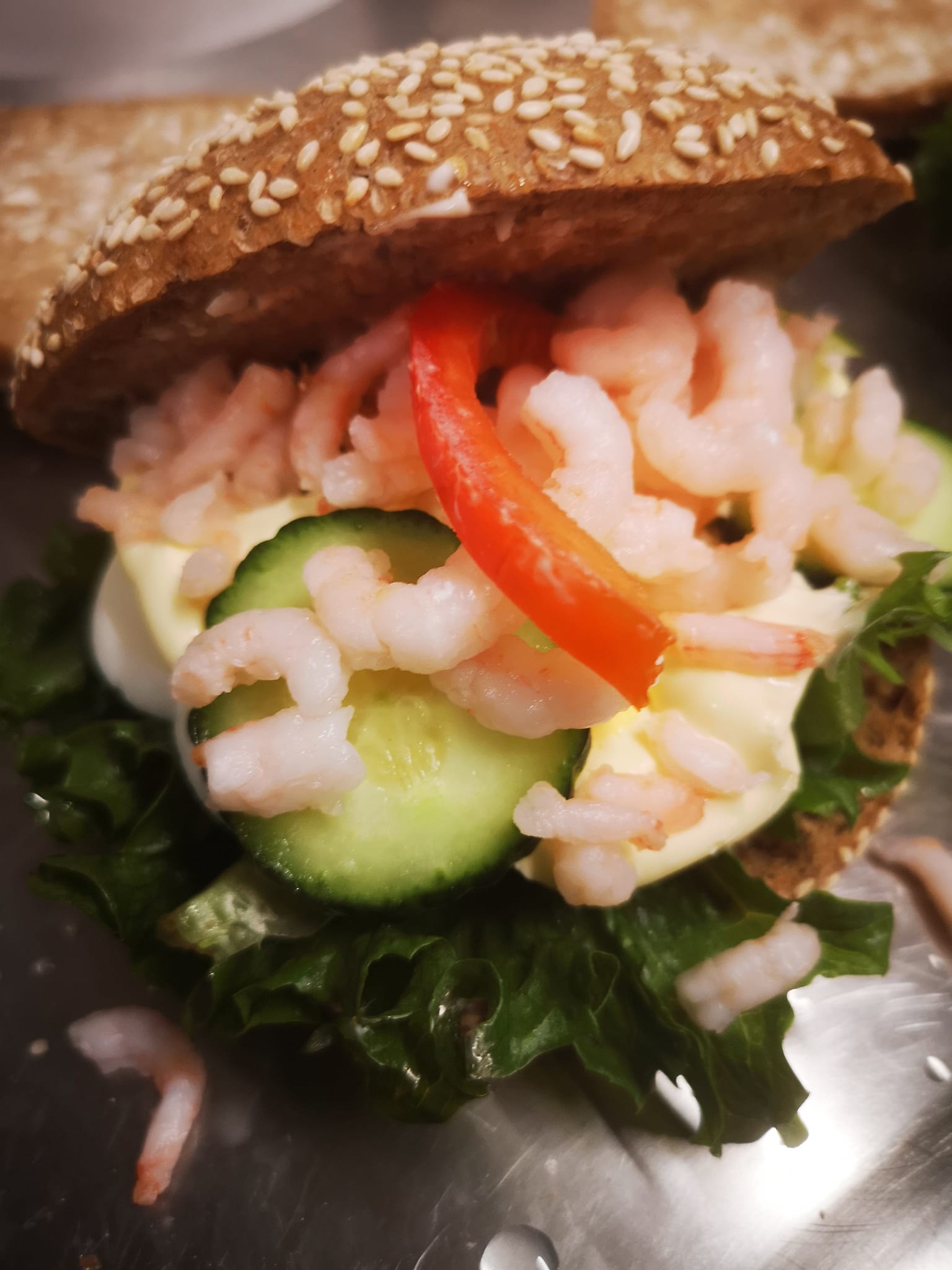 • Mørk sesambolle m.Æg, Rejer, salatdressing salat mayonæse, agurker, peberfrugt , tomat